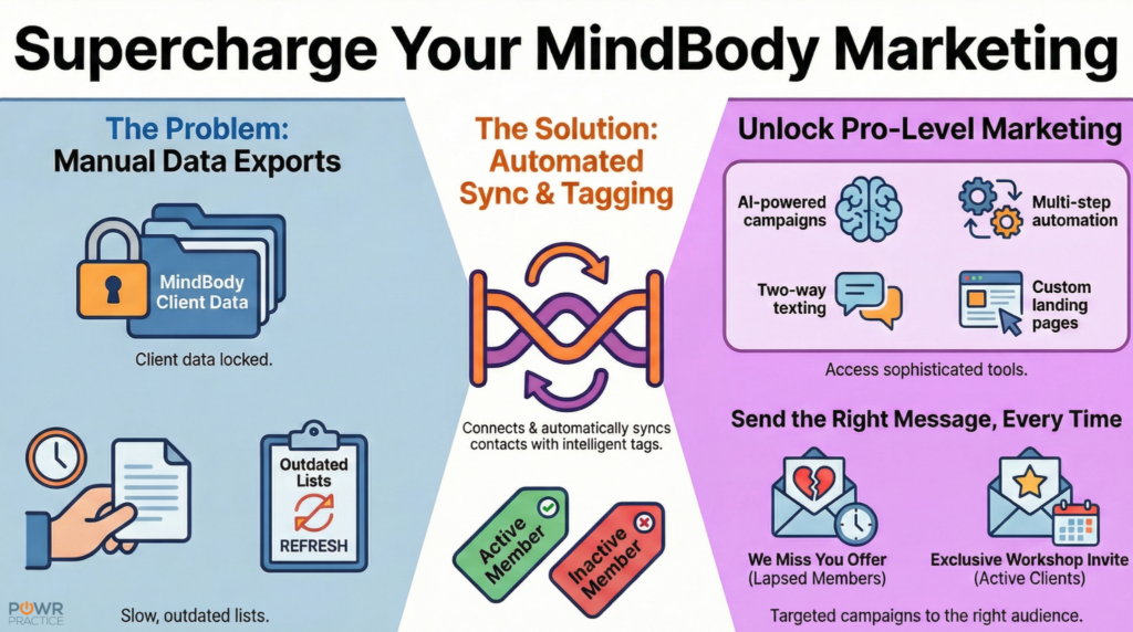 If you’re using MindBody and you’ve been looking for a way to level up your marketing without abandoning the operational platform you trust, this integration might be exactly what you need. It’s not about replacing what works—it’s about adding the marketing power you’ve been missing. Your clients sync automatically, your campaigns run intelligently, and you finally have the tools to do the targeted, automated marketing your business deserves.