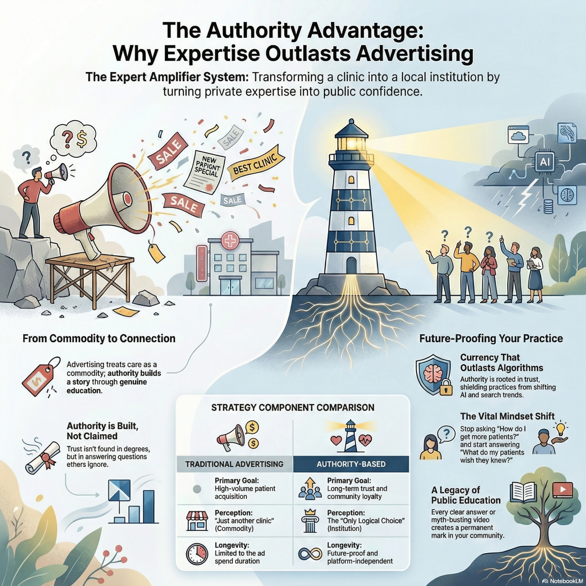 If you feel like your practice is invisible—if you’re tired of competing only on price or location—the truth is, the window for becoming “the authority” isn’t closed. In most communities, it’s wide open. Few clinics are willing to invest in showing their thinking, not just their services. Those who do become irreplaceable.